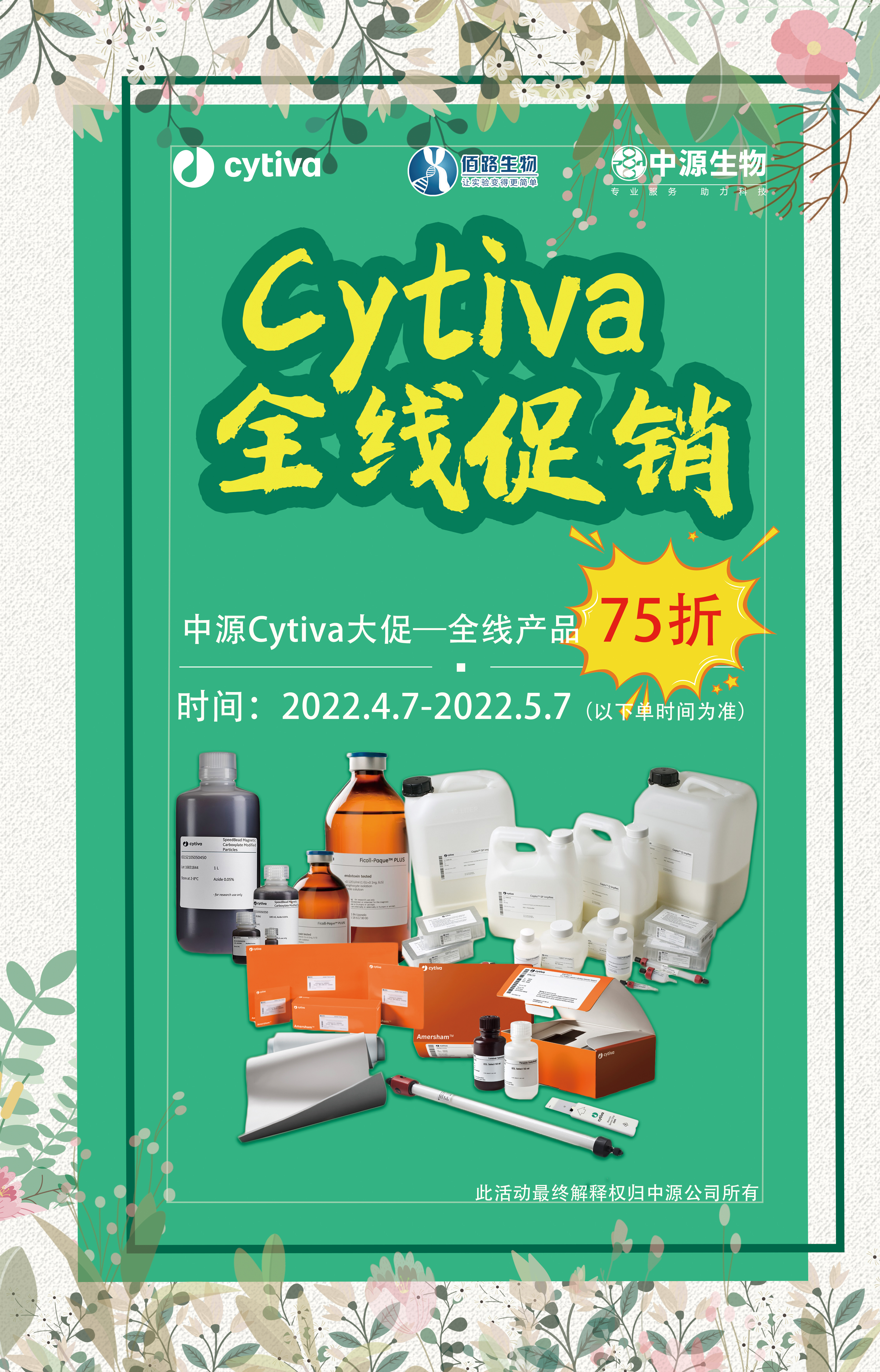 Cytiva全线产品7.5折 活动时间:2022年4月7日起至5月7日 速速致电中源公司销售订购2022-04-13 13:34:00.0