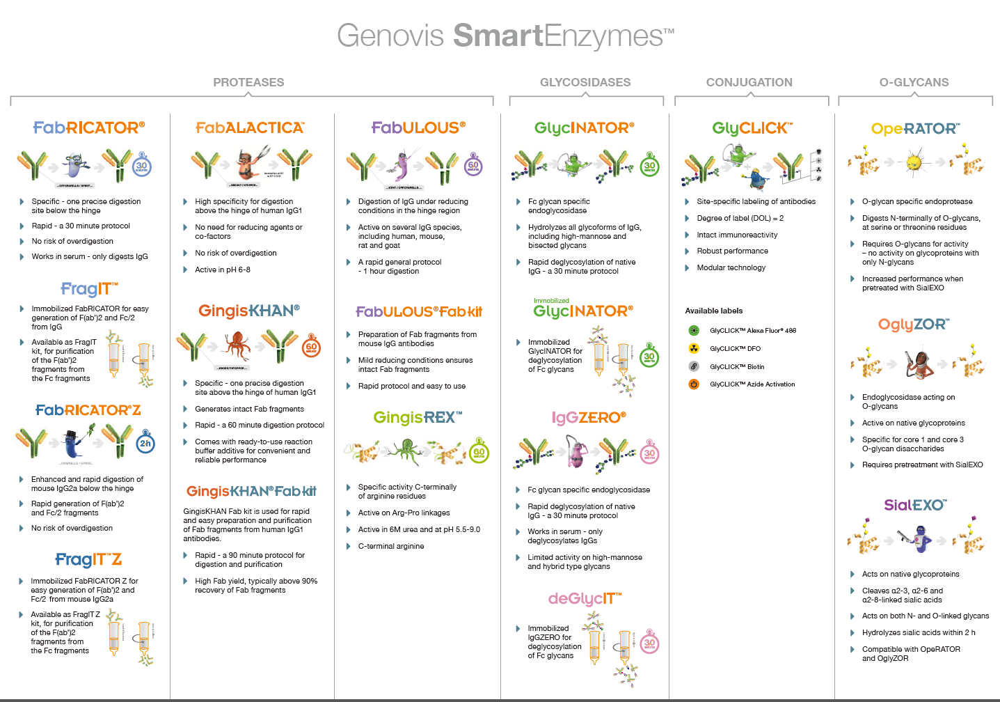 Genovis成立于1999年,由Genovis AB(瑞典)和全资子公司Genovis Inc(USA)组成。Genovis开发出一系列独特的智能酶(SmartEnzymes )。相比于传统酶,这些产品能快速高效的完成特异性酶切反应,提供更高质量的实验结果,有助于生物药物的开发和质量控制。Genovis公司股票已在纳斯达克上市。