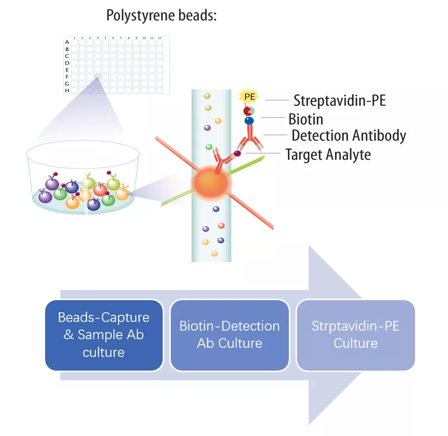 R&D Systems® 拥有 Luminex Assay 以及 Luminex High Performance Assay 两个产品系列,均基于带有颜色编码的微球,这些微球表面包被了识别不同目标分析物的特异性抗体。当预包被的微球与待检样本孵育时,分析物被微球捕获,经由生物素标记的特异性检测抗体混合物识别,加入链霉亲和素 - PE 荧光素底物后发光并进行定量检测。