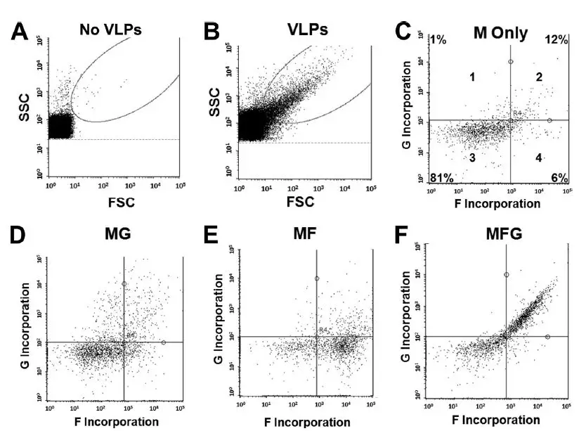 作者利用Guava 8HT检测发现,相较于下图A中PBS缓冲液,图B中VLPS病毒FSC/SSC信号可以很好的与背景分开。图C-F显示分别连接了1种、2种和3种不同病毒糖蛋白片段后VLPs在四象限门内的表达变化。