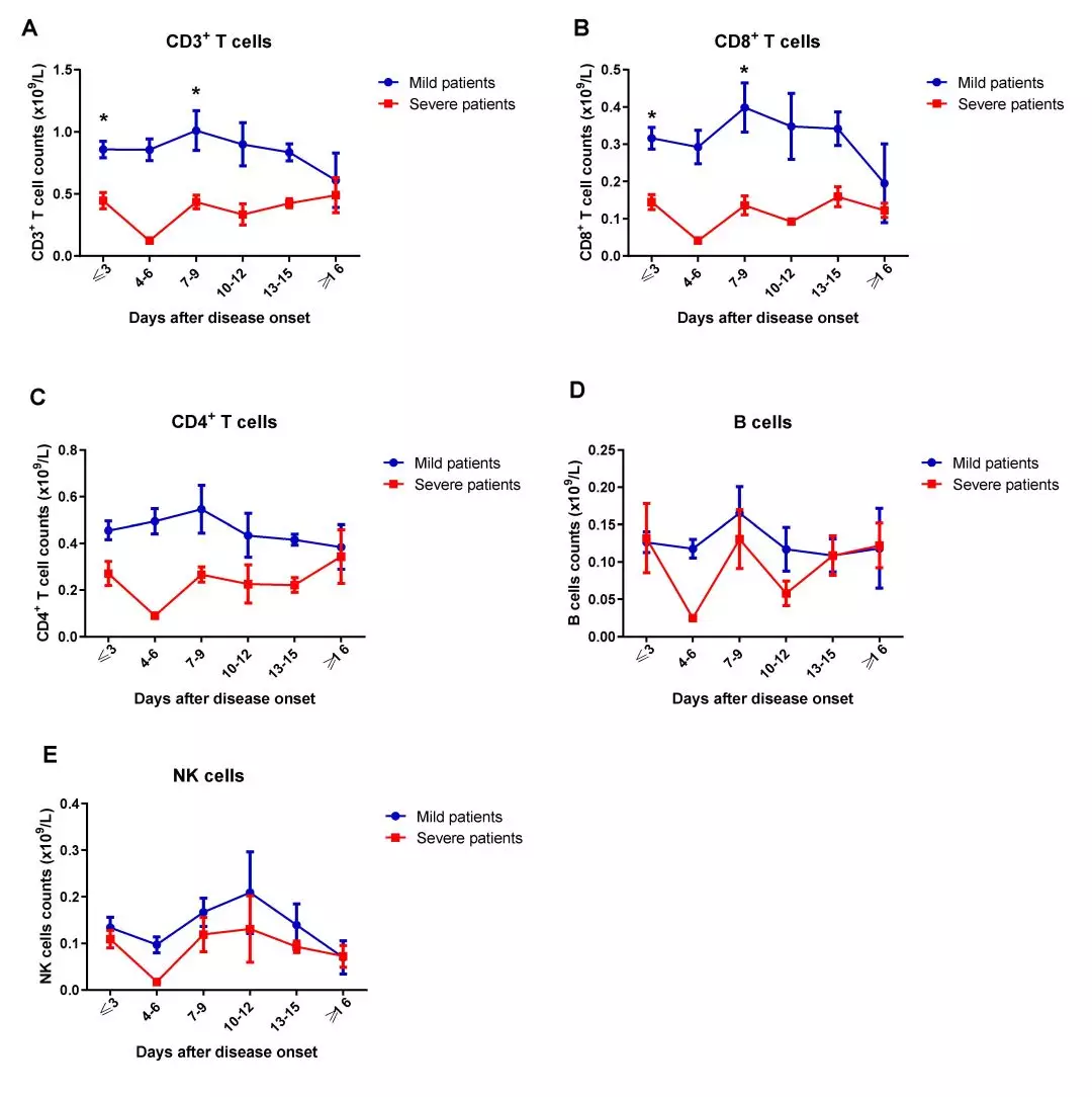 2. 与轻症患者相比,重症患者CD3+ T细胞、CD4+和CD8+T细胞亚群计数持续下降,而B细胞和NK细胞计数无显著性差异(下图)。