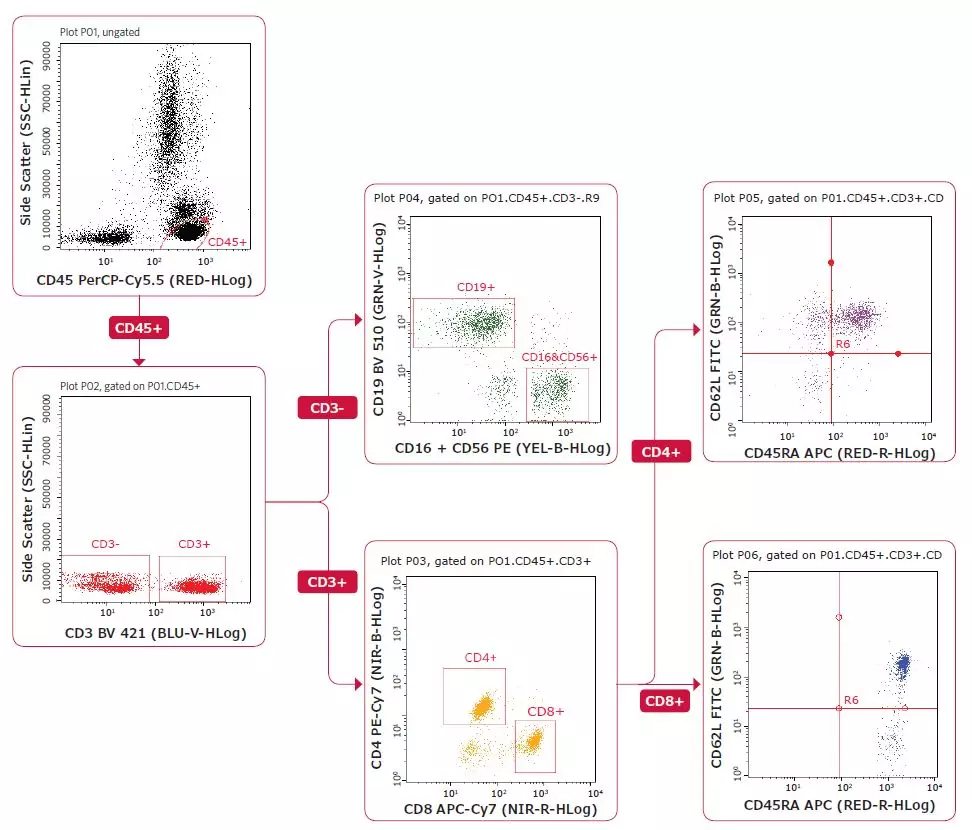 T细胞(CD3+/CD45+)再用CD4 vs. CD8圈门;