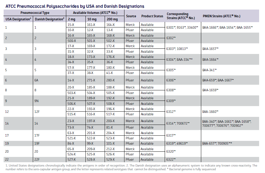 为了帮助分析和预防肺炎球菌病,ATCC可提供多种不同来源的肺炎球菌多糖。ATCC从Merck和Pfizer公司获得肺炎多糖(这些产品由Merck和Pfizer公司生产,抗原性也分别由其验证)。它们与目前市面上可买到的疫苗的血清型相同。每种多糖产品是被分别提取和纯化的,因此可作为特异性且有效的抗原用于以下研究: