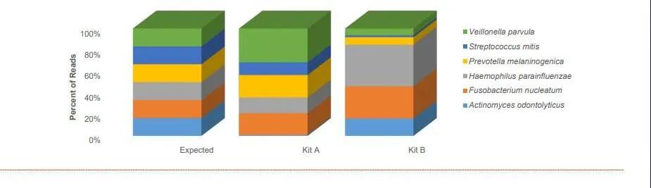 ATCC通过使用两种商业化核酸提取试剂盒对口腔拭子标准品分别做提取实验(图2),与预期结果做对比以此来优化核酸提取方法。(口腔拭子基因组标准品ATCC® MSA-1004™和口腔拭子全菌株标准品ATCC® MSA-2004™,均为通过细胞计数等量分配菌株或经荧光定量后等量分配基因组拷贝数产品。)
