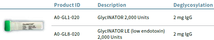 GlycINATOR在第一个乙酰葡萄糖胺(GlcNAc)后切除N-聚糖。GlycINATOR可以有效地从IgG中去除高甘露糖型,以及复合型和杂合型的Fc 聚糖。该反应可在生理条件下快速、温和地进行。该酶作用于天然IgG,并且不需要去垢剂。