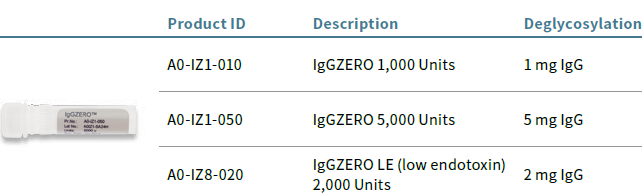IgGZERO 特异性水解IgG F c结构域上的N-聚糖。该酶以冻干粉的形式供应。